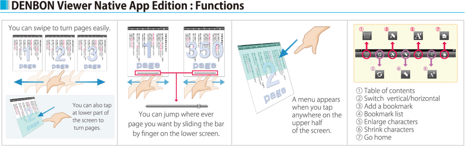 ・縦書き、回転、目次、しおり、早送り、文字の拡大など、電子書籍閲覧に必要な機能を網羅